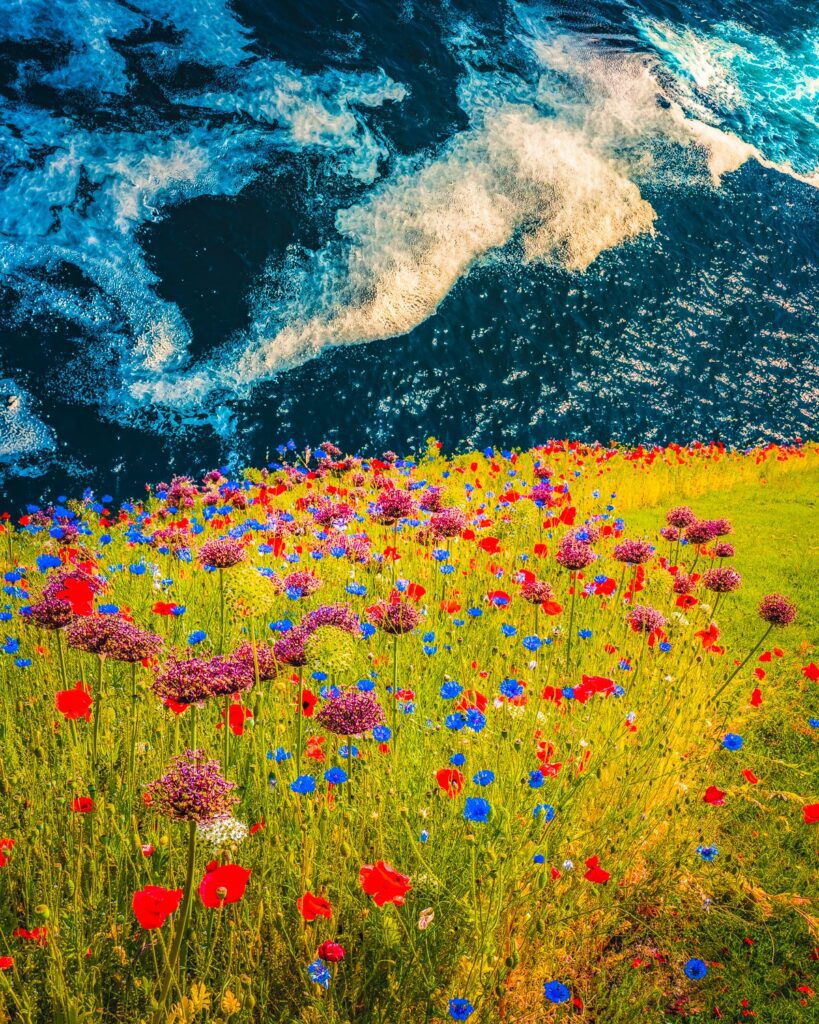 This composite artwork juxtaposes the raw power of the mighty Atlantic Ocean with the enchanting and picturesque beauty of Ireland’s natural wildflower landscape.